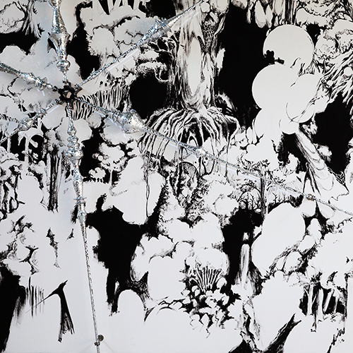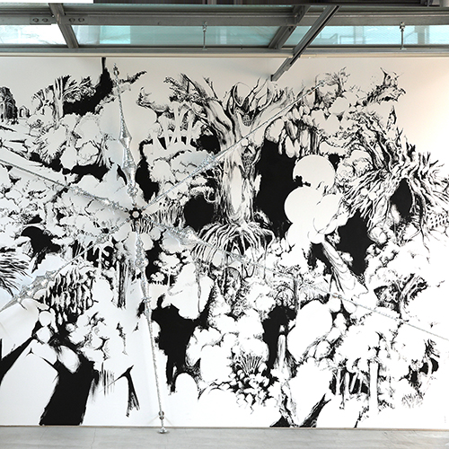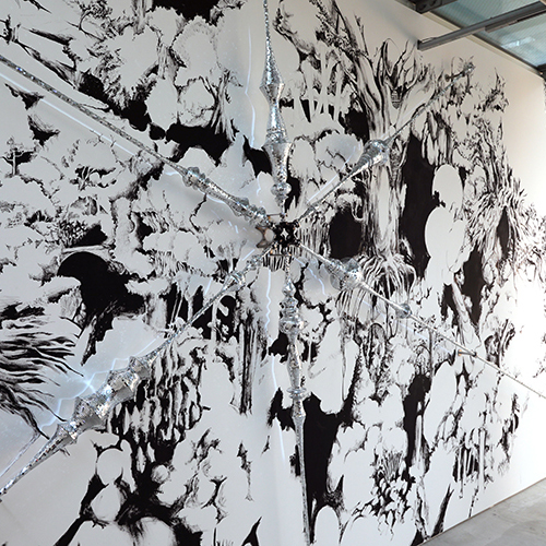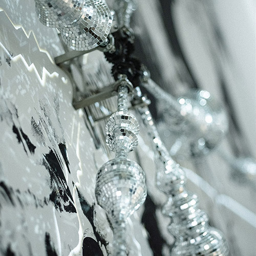 In this solo show, there are many sculptures and drawings with the motif of mirror ball. What is the meaning of a mirror ball? It is one of stage lighting, used to create a dance hall or disco. From a historical perspective, it can be seen as a symbol of minorities in New York, and in Tokyo, it can be associated with the vanity and desire of the bubble era.