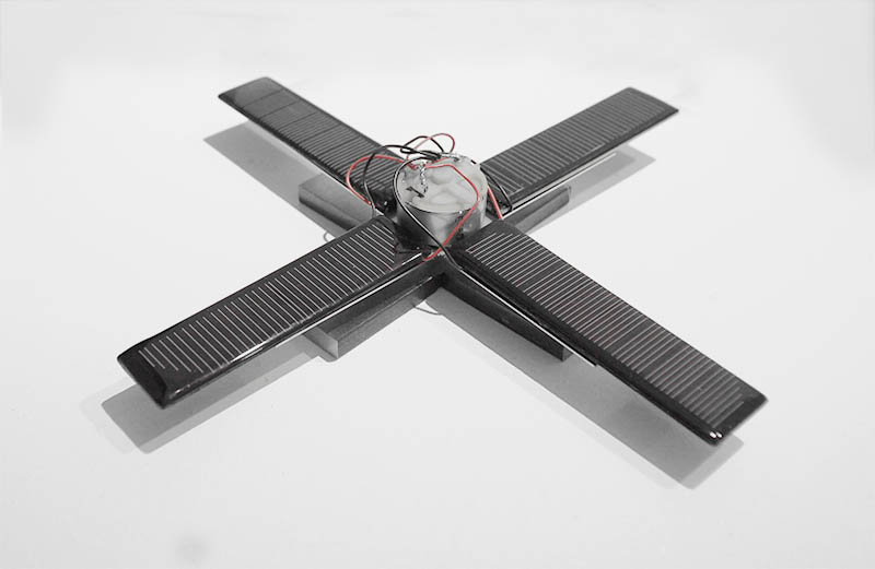 Green Generator no.01 2012 12 x 12 x 1.5 in. (W:32 D:32 H:5 cm) solar panels, motor, propeller, fan, fluorescent light, steel, stainless steel and etc.
